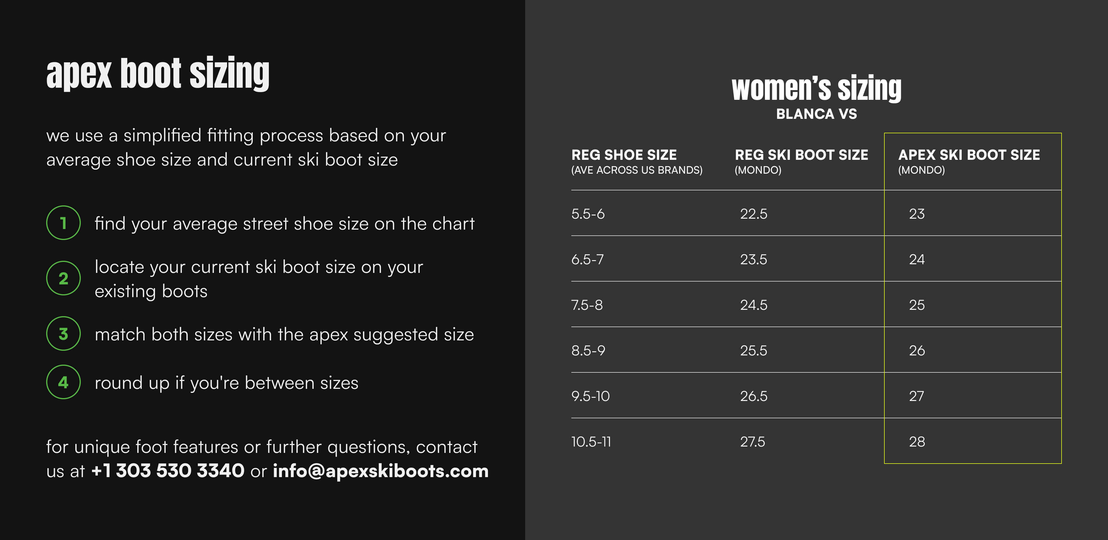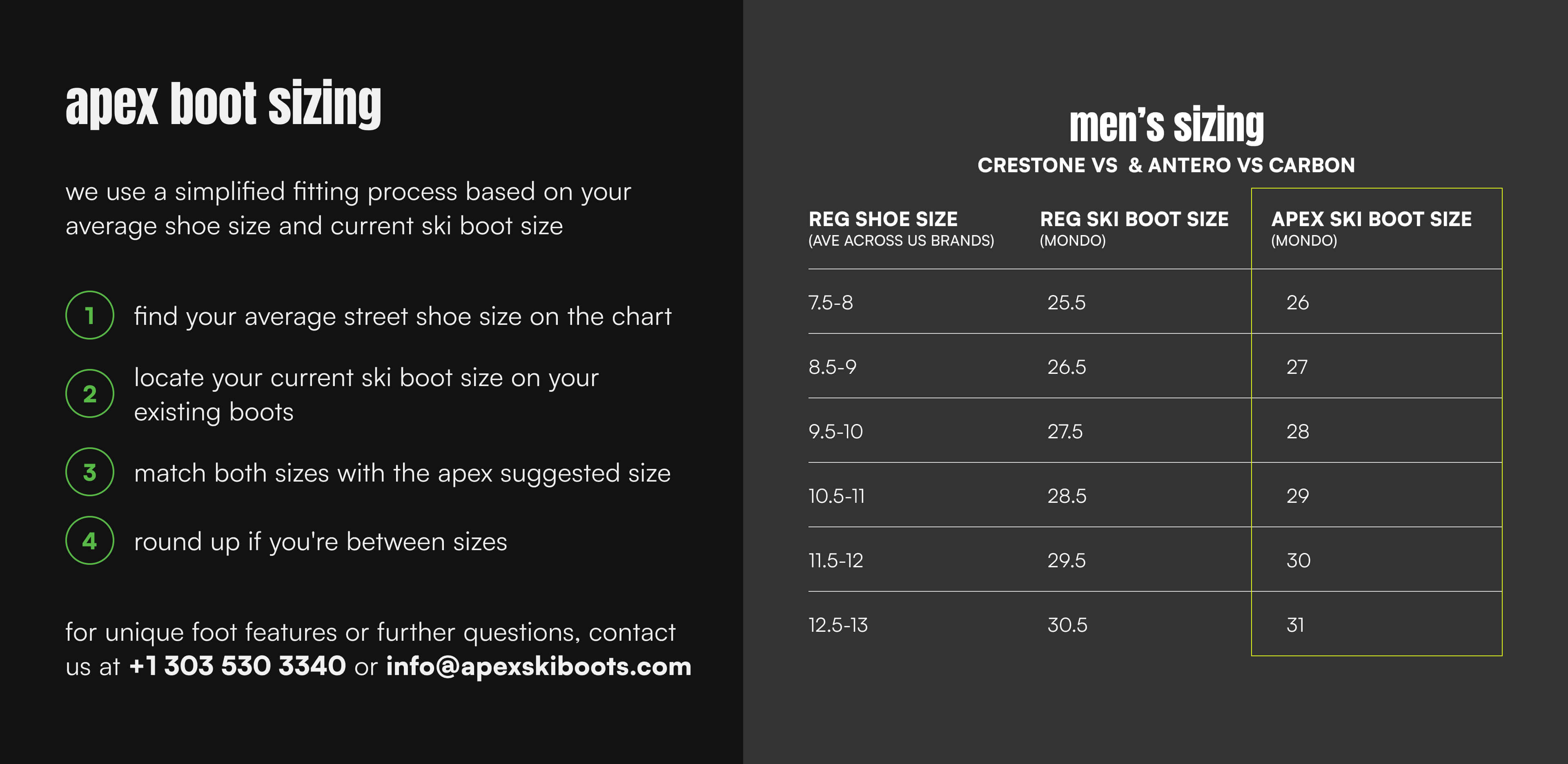 Apex Ski Boots are the only boots that skiers can buy online with confidence because our time-tested sizing system enables us to dial in the right fit for our customers who are buying ski boots online.
