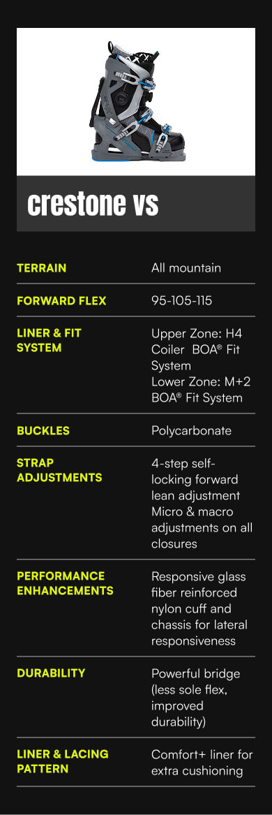 Steep lines, smooth arcs, and everything in between—the Crestone nails the balance so you can ski it all at full tilt.